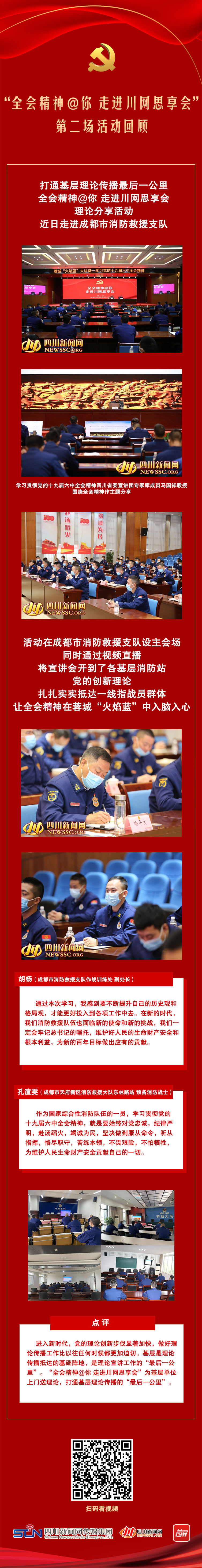 打通基层理论传播最后一公里,活动第二站于近日来到成都市消防救援支队,支队设主会场,同时通过视频直播,将“思享会”开到了各基层消防站,党的创新理论扎扎实实抵达一线指战员群体,让全会精神在蓉城“火焰蓝”中入脑入心。一图回顾活动精彩!