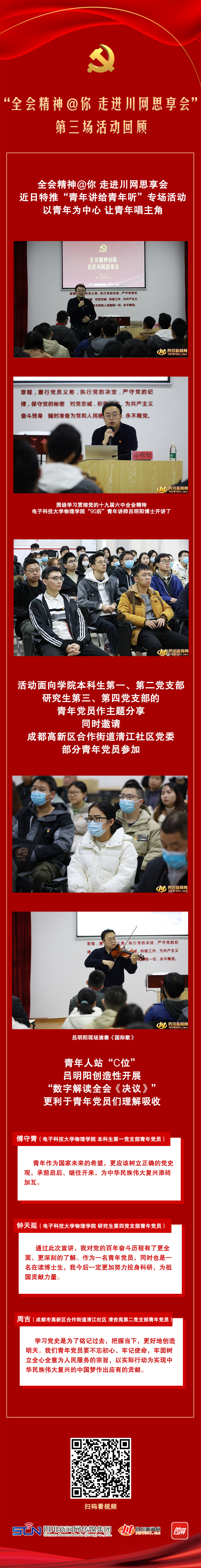 四川新闻网-首屏新闻成都12月28日讯 为深入学习贯彻党的十九届六中全会精神,四川新闻网、首屏新闻联合有关权威部门,遴选专家学者、青年讲师下到基层一线、进到学校课堂,开展面对面理论分享活动——“全会精神@你 走进川网思享会”,让党的创新理论“飞入寻常百姓家”。